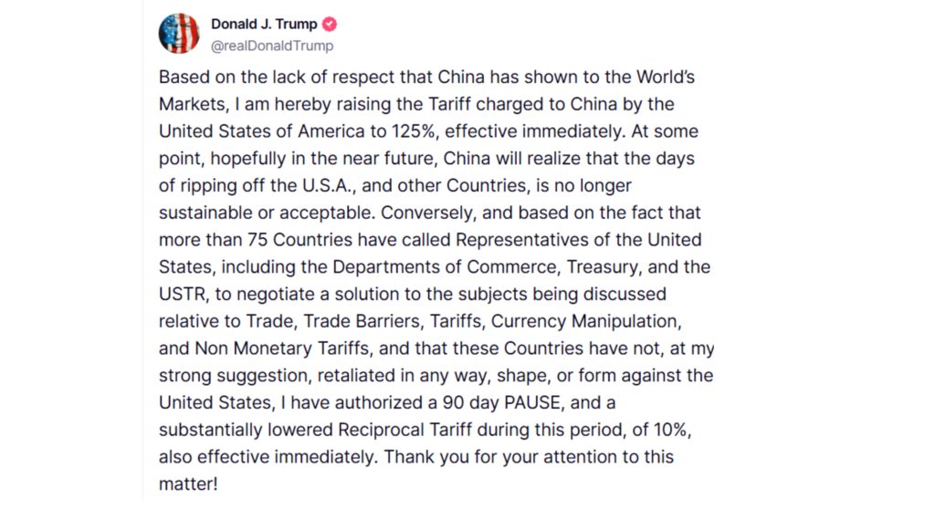 Trump je sporočil tudi: “Zaradi pomanjkanja spoštovanja, ki ga je Kitajska izkazala, višam tarifo, ki jo Kitajski zaračunavajo Združene države Amerike, na 125 odstotkov, kar začne veljati takoj. Na neki točki, upajmo, da v bližnji prihodnosti, bo Kitajska spoznala, da dnevi izkoriščanja ZDA in drugih držav niso več vzdržni ali sprejemljivi.”