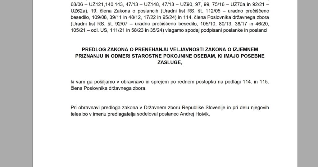 “V primeru, da se bo večina volivcev v nedeljo, 11. maja 2025 izrekla proti Zakonu o dodatku k pokojnini za izjemne dosežke na področju umetnosti (ZDPIDU), je na podlagi jasno izražene volje ljudstva potrebno tudi zakon o izjemnem priznanju in odmeri starostne pokojnine osebam, ki imajo posebne zasluge (ZIPO), nemudoma razveljaviti.” Tako so poslanci SDS pojasnili, zakaj so včeraj v državnem zboru predlagali zakon o prenehanje veljavnosti zakona o pokojninskih dodatkih za posebne zasluge iz leta 1974. Predlog ukinitve ZIPA je prva podpisala vodja poslanske skupine SDS Jelka Godec. Stranka s tem tudi odgovarja na ugovore na referendum iz vladnih strank, da bo, če ljudje zavrnejo uzakonitev visokih dosmrtnih pokojninskih dodatkov za umetnike, ki so jih uzakonili poslanci Svobode, SD in Levice, še vedno veljal stari zakon, po katerem so več sto privilegijev razdelile vlade Janeza Drnovška, vse prihodnje pa v seštevku le nekdaj deset. Še največ med temi vlade Janeza Janše, ki je ob Drnovšku edini vlado vodil več kot enkrat. Doslej trikrat. Drnovšek jih je petkrat.
