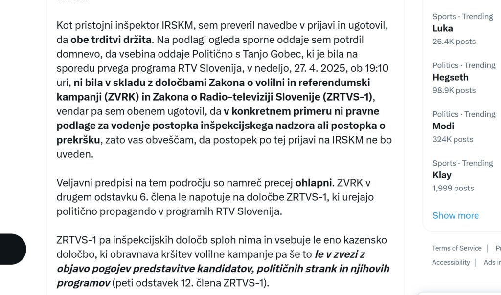 “Na Inšpektorat RS za kulturo in medije (v nadaljevanju: IRSKM) ste naslovili prijavo, v kateri ste opozorili na domnevne kršitve v oddaji Politično, ki je bila na sporedu v času trajanja uradne referendumske kampanje, v njej pa je bilo predstavljeno le eno mnenje. Nadalje pa ste opozorili še na dejstvo, da RTV Slovenija krši pravico do informiranja s skrajševanjem referendumske kampanje na zgolj dva tedna. Kot pristojni inšpektor IRSKM, sem preveril navedbe v prijavi in ugotovil, da obe trditvi držita. Na podlagi ogleda sporne oddaje sem potrdil domnevo, da vsebina oddaje Politično s Tanjo Gobec, ki je bila na sporedu prvega programa RTV Slovenija, v nedeljo, 27. 4. 2025, ob 19:10 uri, ni bila v skladu z določbami Zakona o volilni in referendumski kampanji (ZVRK) in Zakona o Radio-televiziji Slovenije (ZRTVS-1), vendar pa sem obenem ugotovil, da v konkretnem primeru ni pravne podlage za vodenje postopka inšpekcijskega nadzora ali postopka o prekršku, zato vas obveščam, da postopek po tej prijavi na IRSKM ne bo uveden.”
