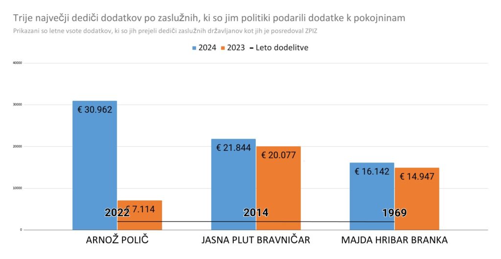 Čudaštvo zakona o dodatkih k pokojninam za zasluge kažejo podatki o prejemnikih najvišjih dodatkov k pokojninam v letu 2024, ki mi jih je včeraj poslal ZPIZ. Povsem na vrhu je s 30.965 evri Arnož Polič, katerega zasluga za narod je, da je sin Radka Poliča. Vsak mesec mu je na račun zaradi tega padlo 2.580 evrov dodatka. Dodeljen mu je bila “dediščina” 16. 9. 2022.