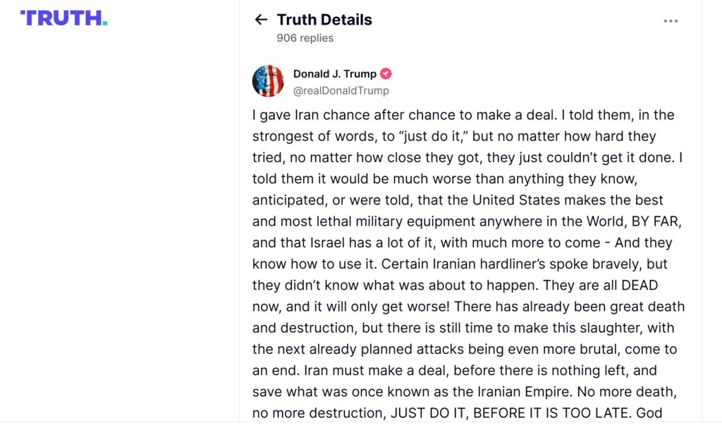 “Iranu sem dajal priložnost za priložnostjo, da sklene dogovor. Z najostrejšimi besedami sem jim govoril, naj “preprosto naredijo to”. Toda ne glede na to, kako zelo so se trudili, ne glede na to, kako blizu so bili, tega preprosto niso mogli storiti. Rekel sem jim, da bo veliko huje, kot so vedeli, pričakovali in bilo jim je povedano, da Združene države Amerike izdelujejo najboljšo in najbolj smrtonosno vojaško opremo kjerkoli na svetu, DALEČ NAJBOLJŠO, in da je ima Izrael veliko, še veliko več pa je bo – in da jo znajo uporabljati. Nekateri iranski predstavniki trde linije so pogumno govorili, vendar niso vedeli, kaj se bo zgodilo. Zdaj so vsi MRTVI in samo še huje bo! Že je bilo veliko smrti in uničenja, vendar je še vedno čas, da se ta pokol, pri čemer bodo naslednji že načrtovani napadi še bolj brutalni, konča. Iran mora skleniti dogovor, preden ne ostane ničesar, in rešiti tisto, kar je bilo nekoč znano kot Iranski imperij. Nič več smrti, nič več uničenja, SAMO NAREDITE TO, PREDEN BO PREPOZNO. Bog vas vse blagoslovi!”