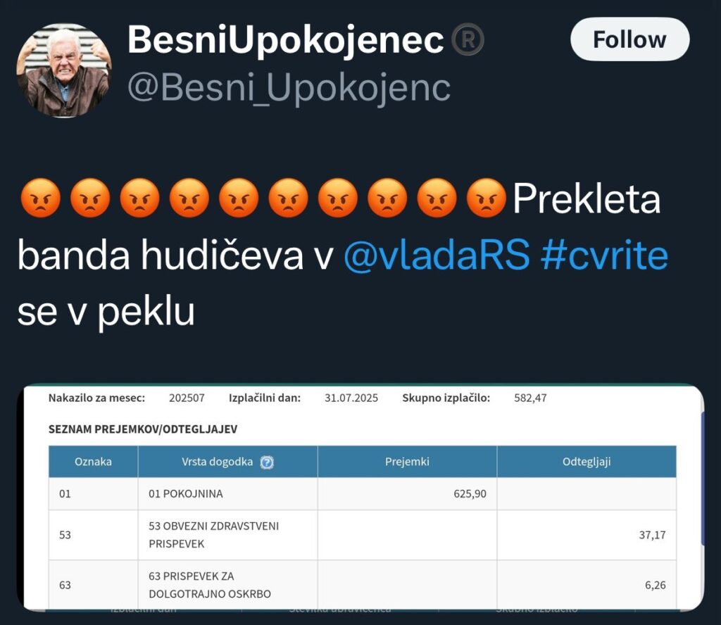 Takšni so bili na omrežju X včeraj odzivi na državno nižanje pokojnin za odstotek: