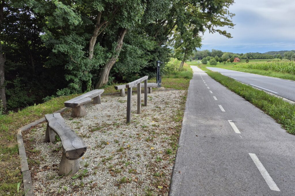 Res dober dodatek na poti je bil že bolj proti koncu za naseljem Lormanje proti Šetarovi, kjer je čisto pravo počivališče za kolesarje, kjer je tudi tlačilka, če uide kaj tlaka iz zračnic in nekaj orodja za najnujnejša popravila. Predvsem pa klopce v senci, ki so koristne za tiste dele telesa, ki najbolj trpijo na kolesih, ko si že več kot 50 kilometrov na poti. Ali pa 150 kilometrov, ko si mlajši. Nekoliko besen sem bil le, ko sem opazil nekaj plastenk v globeli zadaj, čeprav je na postajališču čisto spodoben koš za smeti. Moja domovina in njeni ljudje.