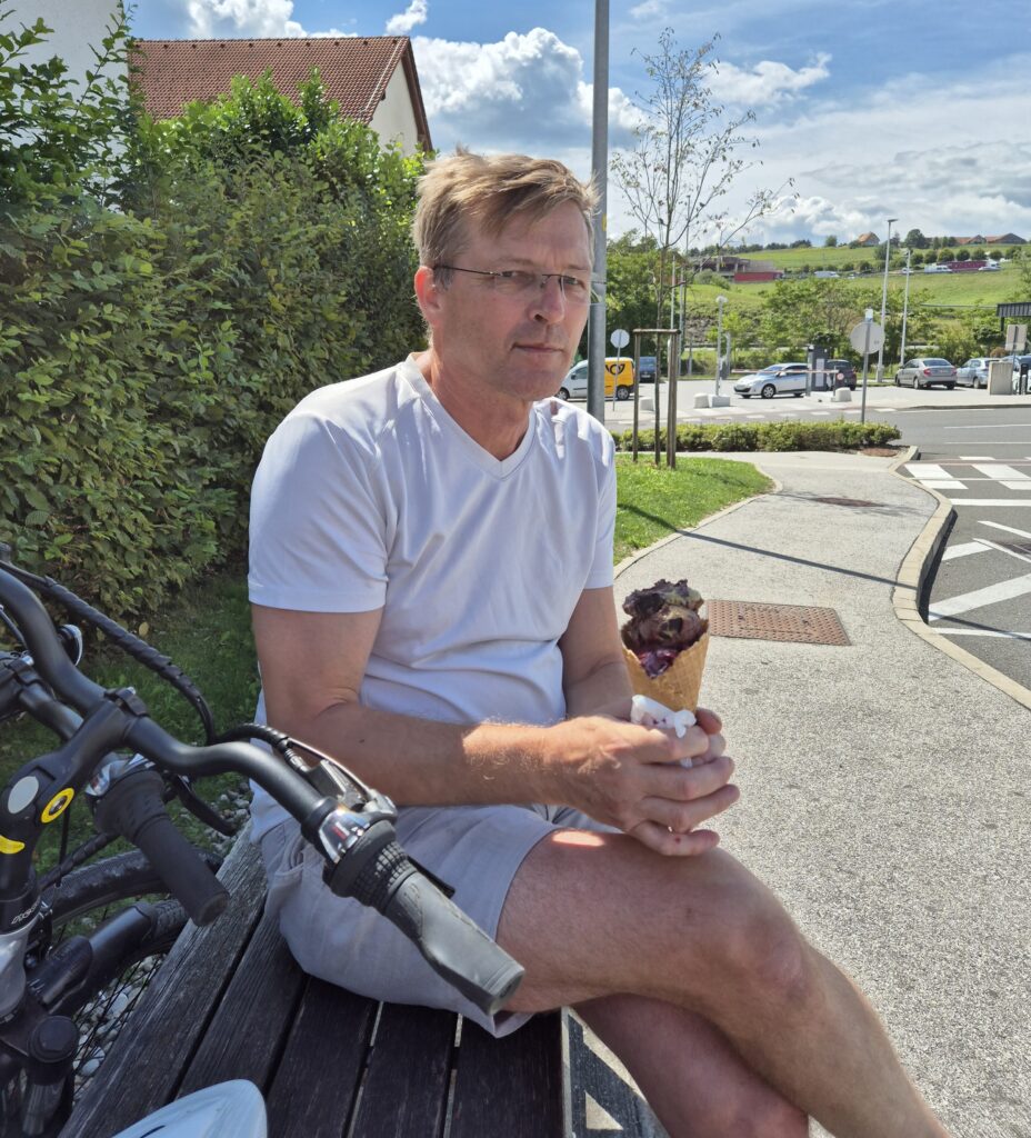 Glavna stvar na kolesarski poti je cilj. In cilj je bil sladoled v Šentilju, kjer smo že bili, le da doslej vsakič z avtomobilom. Kupiti je tam mogoče sladoled, za katerega je vredno zaviti iz avtoceste v mestece. To smo nekoč počeli, ko je bil še bencin cenejši, če si šel iz avtoceste. Prihranek je bil ravno za sladoled. Zdaj je vlada to razliko ukinila.