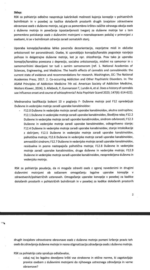 Iz razširjenega strokovnega kolegija za psihiatrijo univerzitetne psihiatrične klinike v Ljubljani so parlamentu poslali protest, ker se ne strinjajo, da bi bilo kajenje marihuane pri njih dovoljeno v posebnih prostorih za kadilce. Učinke, ki jih povzroča marihuana, v psihiatričnih ustanovah zdravijo, opozarjajo na psihiatriji. Rabi v psihiatričnih bolnišnicah zaradi tega nasprotujejo zaradi strokovnih in etičnih vzrokov. Bolj svobodno uživanje “trave” in prepoved obveznih testiranja zaposlenih, ali se drogirajo, poskušajo uzakoniti poslanci Svobode in Levice. Prvi podpisani pod predlogom sta Sara Žibrat (Svoboda) in Nataša Sukič (Levica).