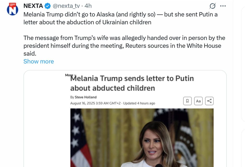 Pismo Melanije Trump, ki govori tudi o ruskih ugrabitvah ukrajinskih otrok, je Vladimirju Putinu na srečanju na Aljaski osebno predal Donald Trump. Točne vsebine pisma svetovne agencije niso predstavile, omenjalo pa bi naj ugrabitve otrok ruskih okupatorjev. Rusi so brez soglasja staršev ali skrbnikov odpeljali več deset tisoč ukrajinskih otrok v Rusijo ali jih zadržujejo na okupiranih ozemljih.