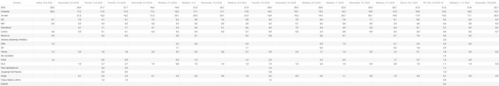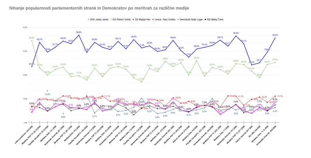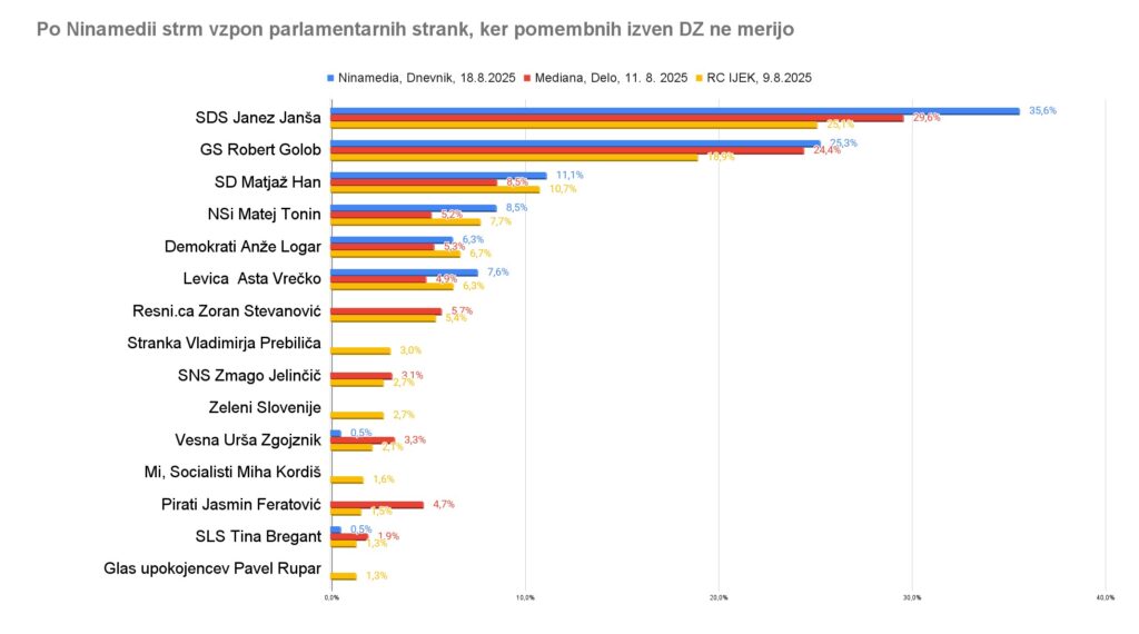 V primerjavi z meritvijo Valicona za Siol.net pred dvema tednoma je Ninamedia pokazala celo velikanski skok podpore SDS. Skoraj že povsem neverjetnega. Visokega pa po Ninamedii tudi v primerjavi z vsemi drugimi meritvami javnega mnenja zadnji mesec. A tega na Dnevniku ne povedo. Še manj pa na Siol.net, ko rezultate povzema na način, ki je značilen za depolitiziran medij Roberta Goloba. V primerjavi z Mediano in IJEK pred tednom (pa tudi Valiconom nekoliko prej) je SDS dosegla celo največji skok podpore med vsemi.