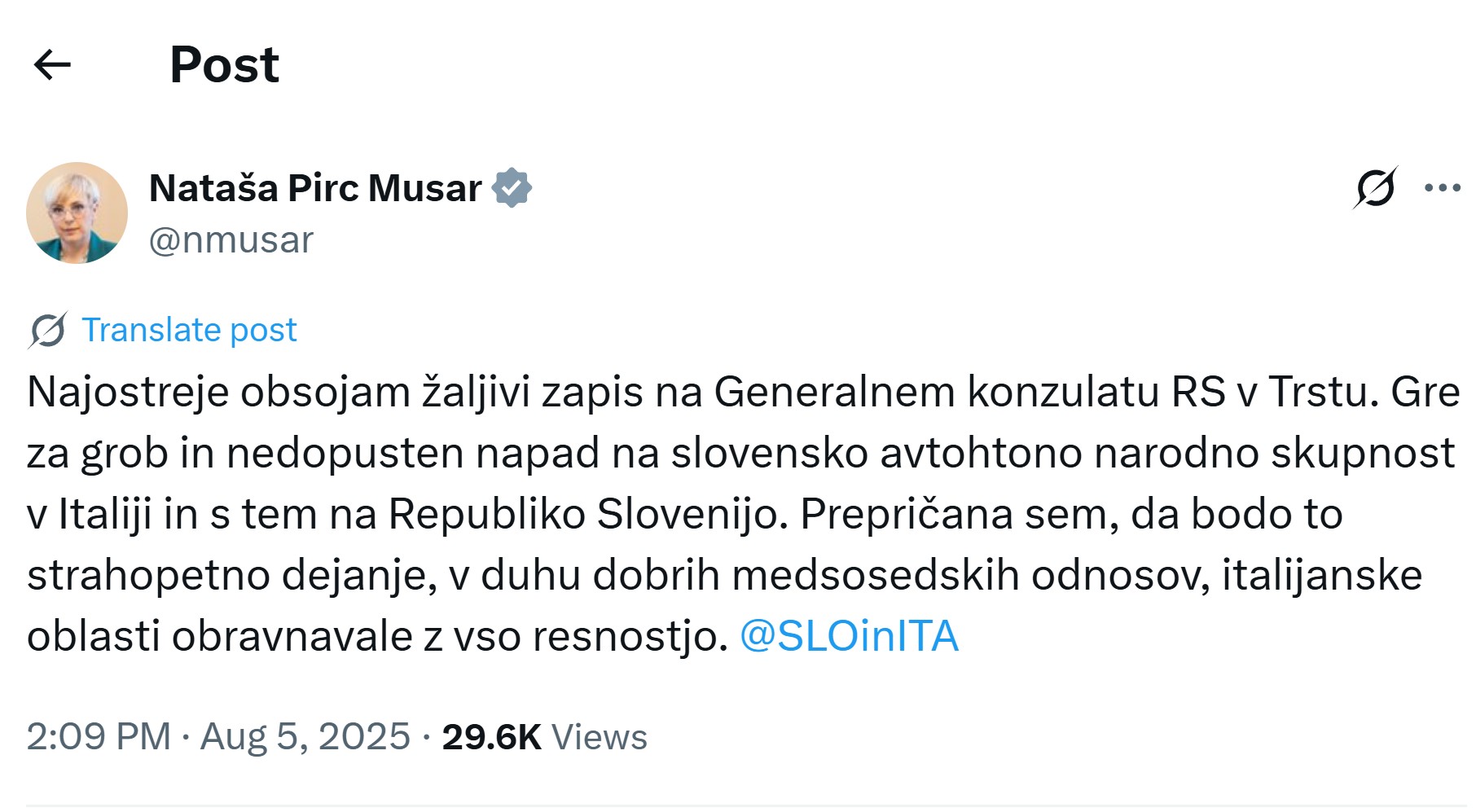 “Gre za grob in nedopusten napad na slovensko avtohtono narodno skupnost v Italiji in s tem na Republiko Slovenijo.” Tako je predsednica republike Nataša Pirc Musar v začetku meseca komentirala napise o usranih Slovanih na našem konzulatu v Trstu. Italijanski preiskovalci pa so zdaj razkrili, kot poroča Primorski dnevnik, da je slovensko narodno skupnost in s tem tudi našo državo napadel Slovenec.