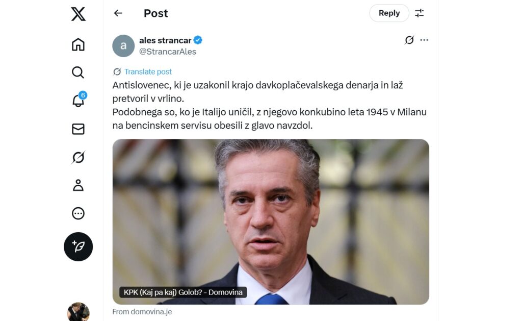Zaradi sporočila na omrežju X, v katerem šefa vlade Roberta Goloba Aleš Štrancar primerja z Benitom Mussolinijem, je policija, kjer je premier izvedel več čistk, že začela preiskovati tega podjetnika. Premier Golob meni, da je objavo mogoče razumeti le kot poziv k likvidaciji, čeprav to nikakor ni tako neposredno razvidno kot je bilo v preteklosti ob Janezu Janši. Isti mediji pa takrat niso reagirali podobno občutljivo. Obratno, grožnje s smrtjo so prikrivali.