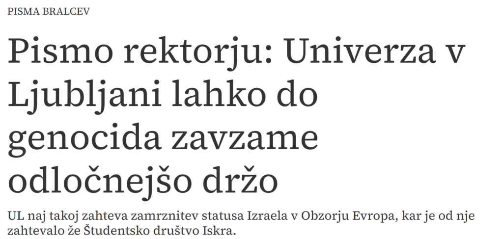 Spomnimo, v Bosni je bil formalno ugotovljen genocid, pa zato ni bilo nobenih pozivov k ustavitvi sodelovanja s srbskimi univerzami. Nobenega poziva nismo iz rektorata dobili glede sodelovanja z Rusijo ali Iranom. Pač pa bi delili štipendije Palestincem iz Gaze. Osvobojeni izraelski talci znajo o njih povedati, da so se do talcev vedli še slabše kot Hamas; da niti eden ni Izraelu pomagal, da bi talce našli in osvobodili.