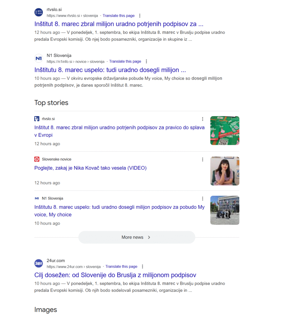 “Kako strahovito medije napihujejo dogodke ob privatnem zavodu 8. marec, kaže izpis iskalnika Google o zbiranju podpisov, s katerimi poskušajo na evropski ravni vplivati, da bi lahko ženske iz držav, kjer otežujejo izvedbe splavov, s financiranje evropske unije splav izvedla v državah, kjer omejitev ni. Ena takšnih, kjer omejitev ni, je Slovenija. Da je 8. marec zbral milijon podpisov in dosegel “zgodovinski” uspeh, mediji poročajo in ponavljajo že štiri mesece.”