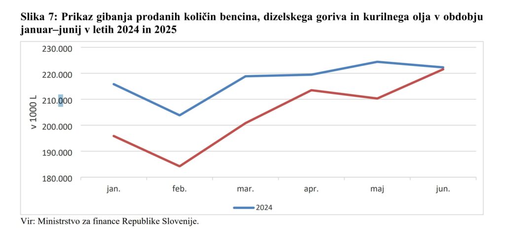 Zmanjšanje prihodkov proračuna so iz vlade pojasnili tako: “Trošarine na naftne derivate (bencin, plinsko olje za pogon in plinsko olje za ogrevanje) zajemajo približno 99 % vseh trošarin na energente in električno energijo, zato je realizacija odvisna predvsem od višine trošarin za te vrste energentov in od prodanih količin. Trošarine od naftnih derivatov in električne energije so v prvi polovici leta znašale 499,2 mio. EUR, kar je za 0,7 % manj kot v enakem obdobju lani in pomeni 45,2 % teh prihodkov predvidenih v sprejetem proračunu za leto 2025. Upad trošarin od energentov je posledica manjših prodanih količin energentov kot v lanskem letu.”