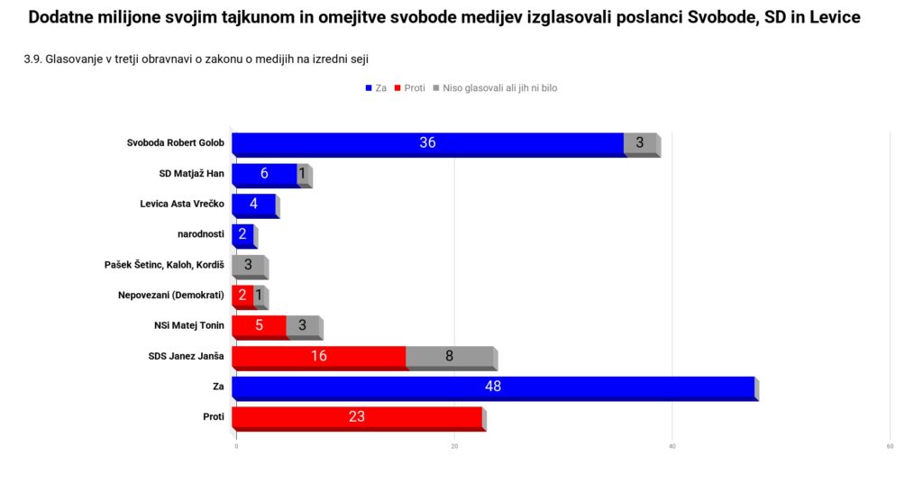 Da bo vlada morala (in ne le da bo lahko) zagotoviti dodatne milijone za digitalizacijo časopisov, ki so digitalizirani že desetletja in podobne projekte, je izglasovalo 48 poslancev, proti jih je bilo 23. Povsem enak je bil rezultat o medijskem zakonu v celoti. Po strankah se je izšlo tako: