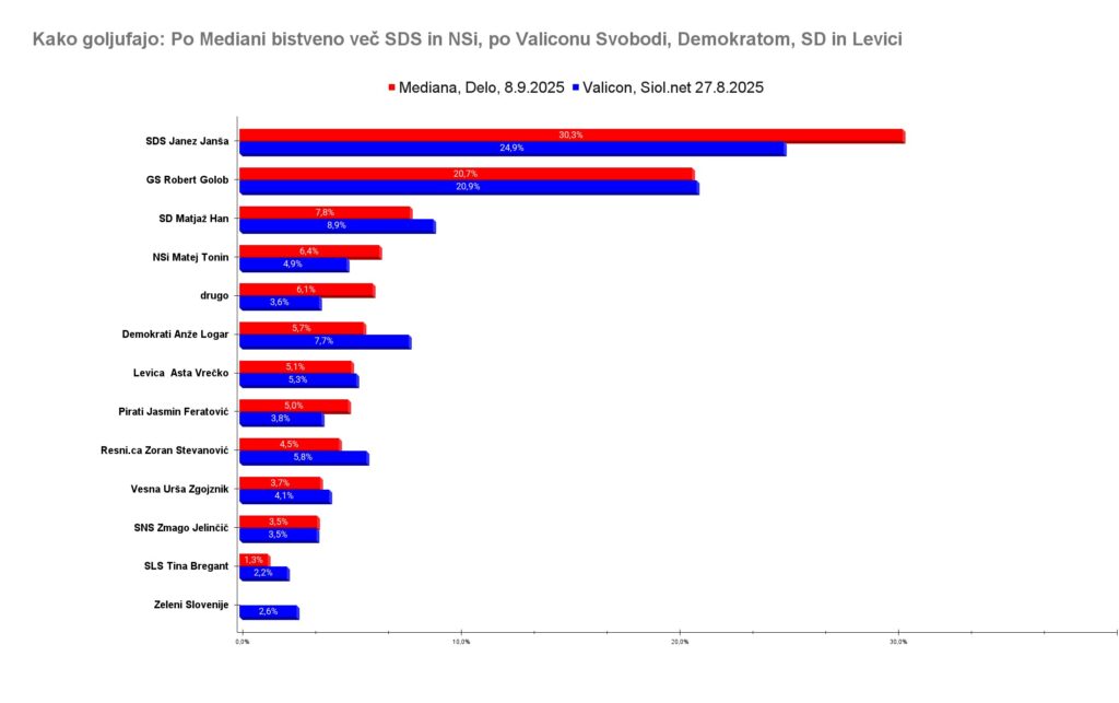 Primerjava rezultatov Mediane za Delo z nedavno raziskavo za Siol.net državnega Telekoma, kjer Robert Golob s predčasnimi menjavami takoj po prevzemu oblasti nastavil svoje kadre, kaže, kako pri nas deluje strankarska propaganda. Po Valiconu, ki so ga na Siol.net angažirali zadnje mesece, verjetno z namenom vplivati na volitve, so se bistveno bolje kot po Mediani odrezale vladne stranke. Slabše pa SDS in NSi.