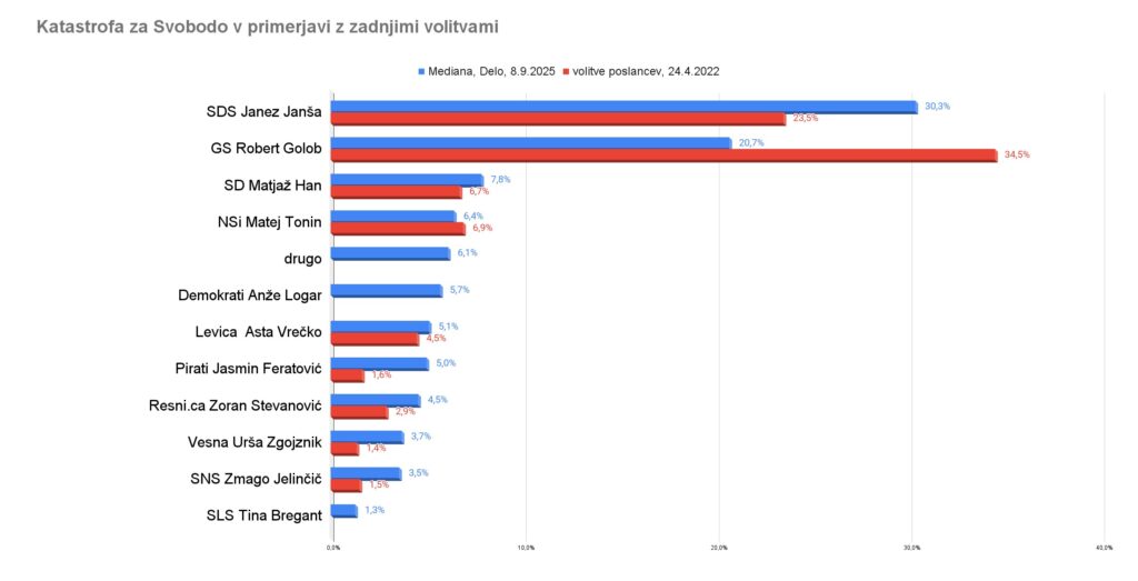 Največja stranka krepko izgublja tudi v primerjavi z meritvijo Mediane za Delo pred mesecem. Primerjava rezultatov z volitvami leta 2022 je takšna: