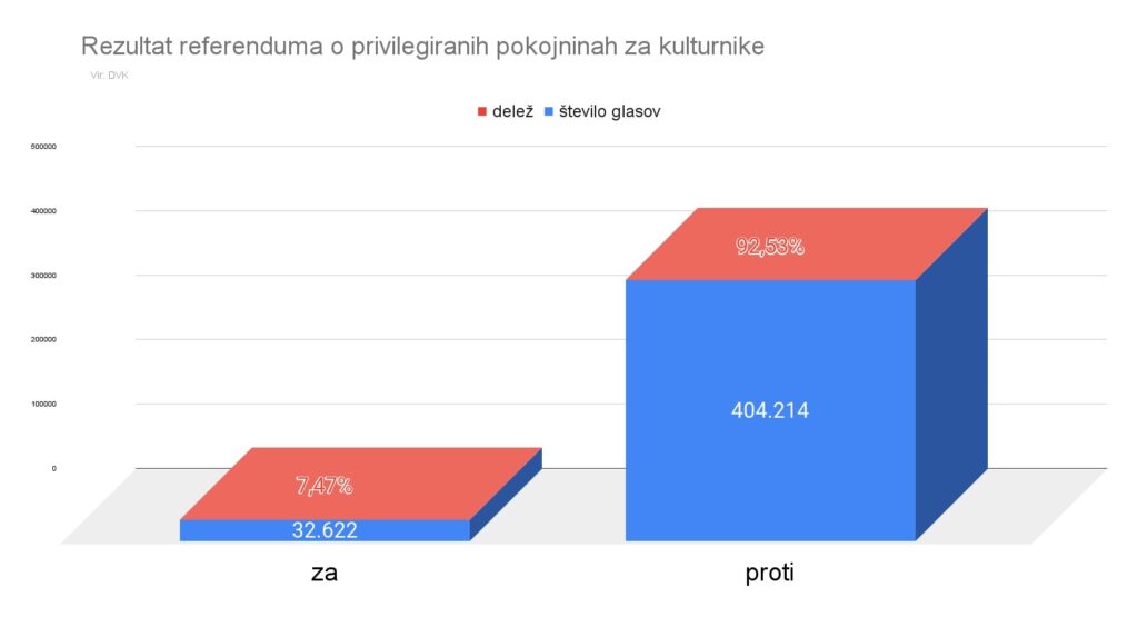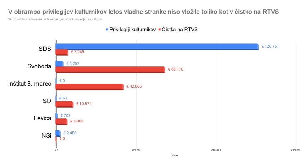 V kampanjo pred referendumom o astronomskih pokojninskih privilegijih za državno nagrajene kulturnike je daleč največ denarja 126.751 evrov vložila SDS Janeza Janše, ki je zbrala tudi 40.000 podpisov za referendum in ga z velikansko večino dobila. Proti dosmrtnim najvišjim mogočim pokojninam za kulturniško elito je bilo 92,5 odstotka glasujočih. Skoraj nič v zagovor svojega projekta izjemnih pokojnin niso investirale vladne stranke. Veliko več je pred leti za kampanjo za čistko vladnih strank na RTVS namenil institut 8. marec Nike Kovač. To kažejo poročila o kampanjah, ki so jih stranke moralo objaviti na Ajpes. Da o koristih lastnega zakona ljudi niti poskusili niso prepričati, je le eden razlogov katastrofalnega poraza na zadnjem referendumu, kakršnega ni napovedala nobena od raziskav javnega mnenja. Svoboda Roberta Goloba je za prepričevanje volivcev, da so parlamentu ponudili in tam izglasovali dober zakon, namenila vsega 4.267 evrov, Levica, katere ministrica Asta Vrečko je na referendum zavrnjene rešitve pripravila, 703 evre. Še manj, le 63 evrov, je za odprtje in zaprtje posebnega računa za kampanjo vložila SD. Vladne stranke so, kažejo ti podatki, posebne račune za kampanje odprle le zaradi tega, da so dobile vabila na soočanje medijev. Sicer pa v svoj zakon niso verjeli in v njegovo promocijo zaradi tega niso vložile nič.