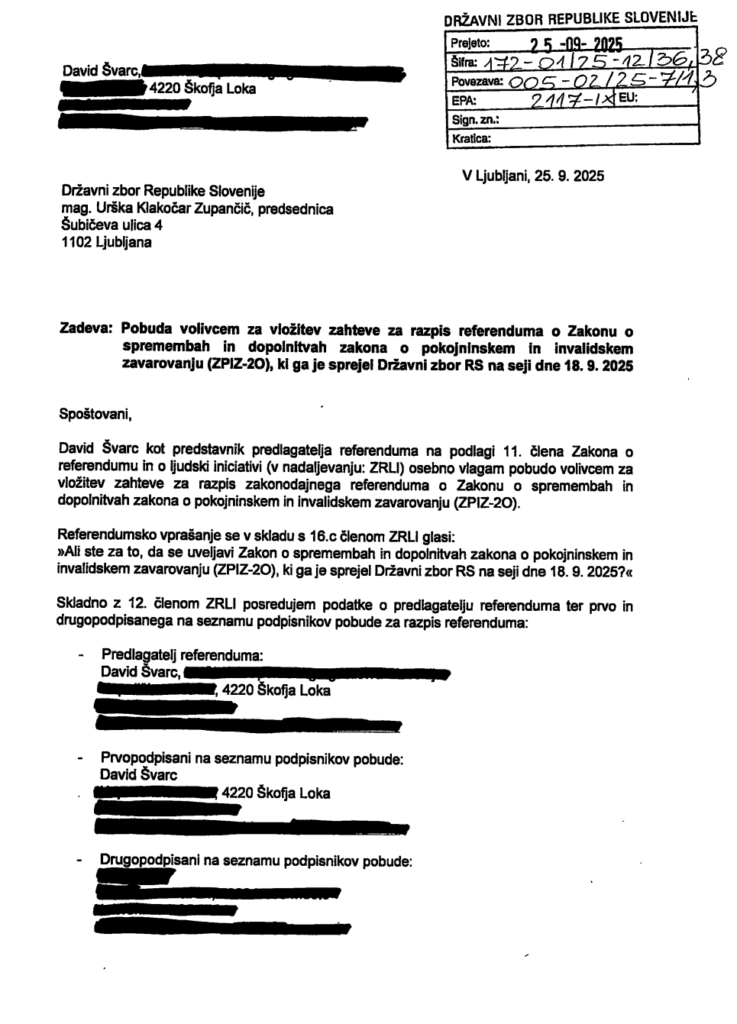 Ker nasprotujejo, da bi morali zaposleni delati dalj časa in da bi bila podaljšana doba za izračun pokojnin, je generalni sekretar sindikata poklicnega gasilstva David Švarc v državni zbor včeraj prinesel podpise za začetek zbiranja 40.000 podpisov za referendum o spremembah pokojninske zakonodaje, ki so jih na hitro na izredni seji ta mesec uzakonili poslanci vladne koalicije ob pomoči Demokratov Anžeta Logarja. Cilj je bil ob dolgoročno finančno bolj vzdržnem pokojninskem sistemu zagotoviti tudi zimski dodatek upokojencev že letos, ki bi bila za te neke vrste božičnica, a v nižjem znesku kot jih premier Robert Golob napoveduje za vse zaposlene v višini 639 evrov. Za zaposlene spremembo zakona, ki bi to višjo božičnico določila, iz vlade še pripravljajo in jo nameravajo šele predlagati parlamentu. Zimski dodatek za upokojence bi bil letos 150 evrov in bi se moral izplačati s pokojnino za mesec november. Kar bo glede na referendumsko pobudo letos težko.