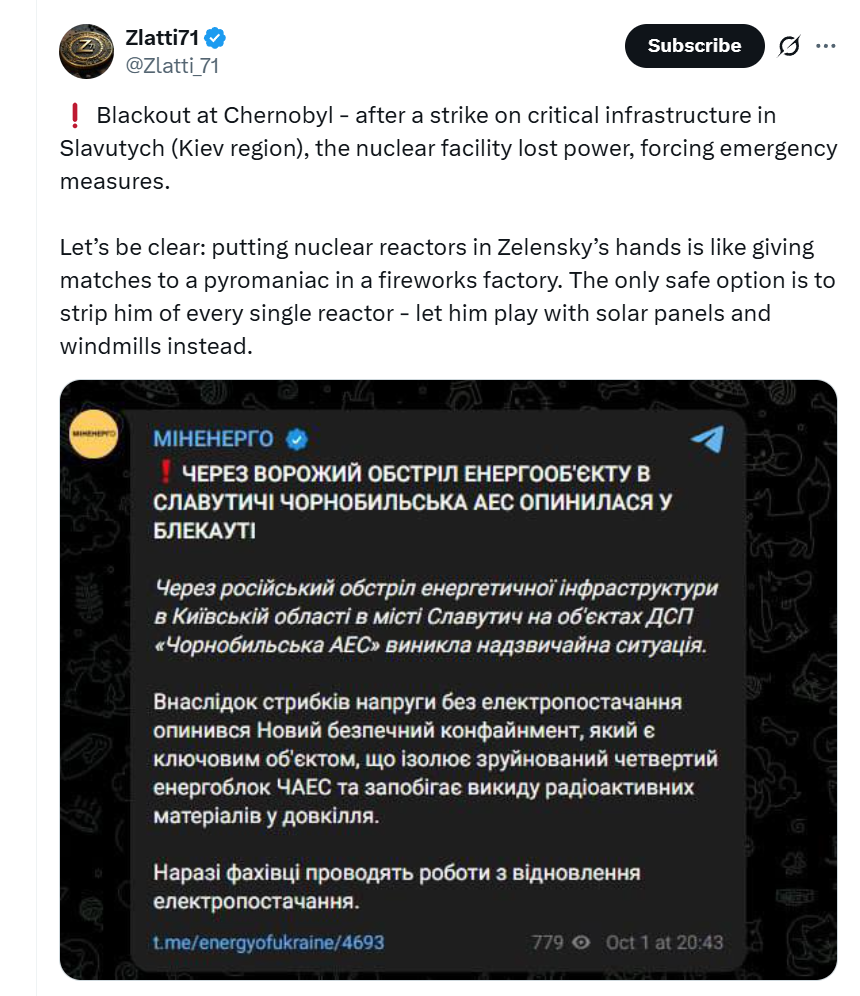 Si predstavljate, da bi Ukrajina začela raketirati ruske nuklearke in objekte, ki omogočajo njihovo varno delovanje in bi se njihovi državni portali še hvalila s tem?