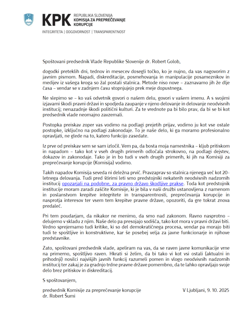 Z javnim pismom premieru Robertu Golobu se je na dogajanje po objavi mnenje KPK o ravnanju šefa vlade v preteklosti odzval predsednik komisije za preprečevanje korupcije Robert Šumi. Pismo objavljam v celoti. Objavljen je po pismu Šumija tudi odziv na pismo Luke Špoljarja, vodje Kabineta predsednika vlade
