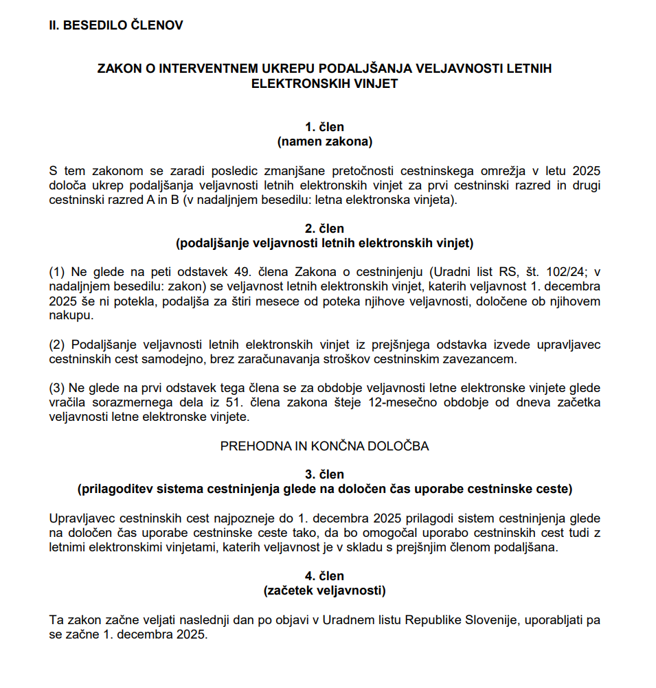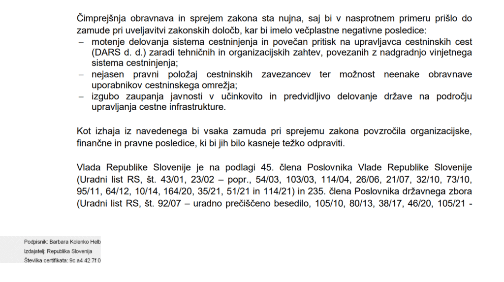Zakon o podaljšanju veljave letnih vinjet, veljavnih 1. decembra, za štiri mesece, ki bodo torej vse brez doplačil veljale vsaj do marca, ko bodo volitve, je vlada že poslala v parlament. Iz vlade trdijo, da podaljšanje veljavnosti predlagajo zaradi obnovitvenih del, ki potekajo na več krakih avtocest in bodo še. Veljavnost za štiri mesece bo podaljšana tudi tistim, ki bodo letne vinjete kupili šele novembra letos, ko bi po nujnem postopku sprejeti zakon moral že veljati. Ker se november hitro bliža, se vladi mudi in predlaga odločanje parlamenta po nujnem postopku, ki je v poslovniku za vojne, naravne katastrofe ali če grozijo težko popravljive posledice za delovanje države. Tako pravi zakon: