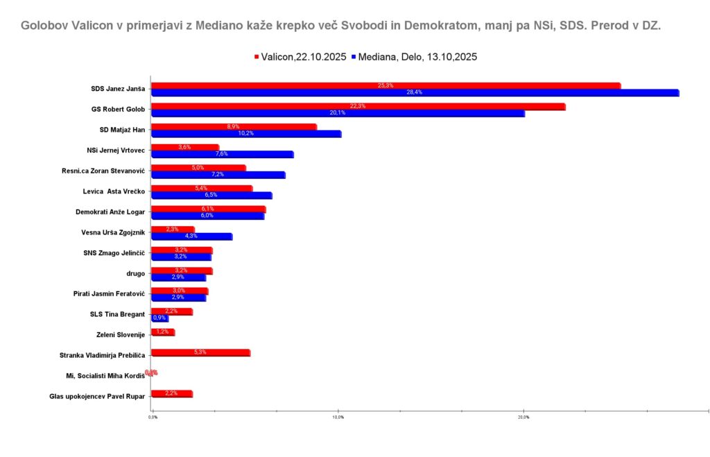 Primerjava rezultatov Valicona z meritvijo Mediane pred tednom, ki meri podoben nabor strank, le da pri Mediani še niso merili nove stranke Prerod Vladimirja Prebiliča, ki je vmes uradno nastala, pokaže, kako Valicon močno “podpira” Golobovo Svobodo. Golobovi stranki bi se naj delež, če primerjamo z Mediano pred tednom, z vstopom Preroda v tednu dramatično povečal, SDS Janeza Janše pa precej upadel.