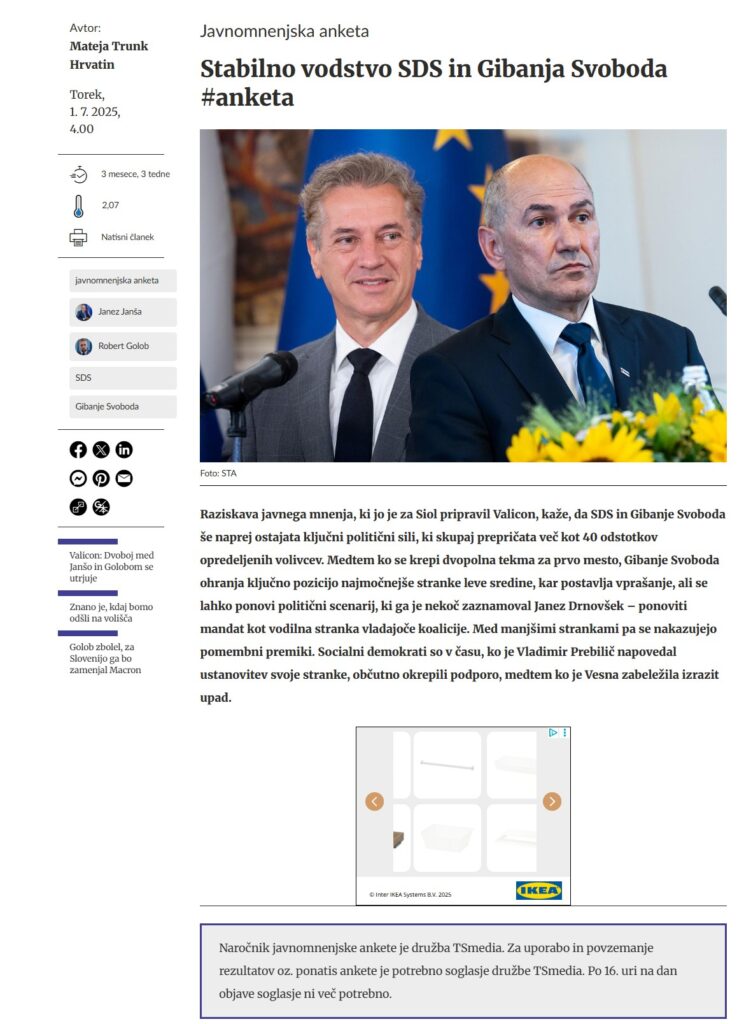 Valicon je letos, ko je vlada izvedla že drugo čistko na Siol.net, nenadoma začel delati raziskavo za ta medij v lasti državnega Telekoma, ko so za direktorja tja vladajoči postavili iz obrambnega ministrstva Rolanda Žela. Žel je bil direktor že v času vlade Marjana Šarca. Pred tem je na SDH, ki je lastnik Telekoma (in s tem Siol.net) nenavadno poletel iz obrambnega ministrstva še Damir Črnčec. Na Siol.net pa je prišla tudi piarovka obrambnega ministrstva Mateja Trunk Hrvatin, ki je zdaj tam zadolžena za propagando za Svobodo in Goloba. Predstavljajo nam jo kot novinarko. “Poroča” pa tudi o uspehih, ki jih Svobodi kažejo raziskave Valicona. A kot kaže so nenavadno sodelovanje z Valiconom na Siol.net prekinili. Ta teden je Valicon svojo meritev objavil brez znanega naročnika. Povzela ga je državna STA in po njej večina medijev. A vsi brez opozoril o tem, da ni znan naročnik in plačnik te raziskave.