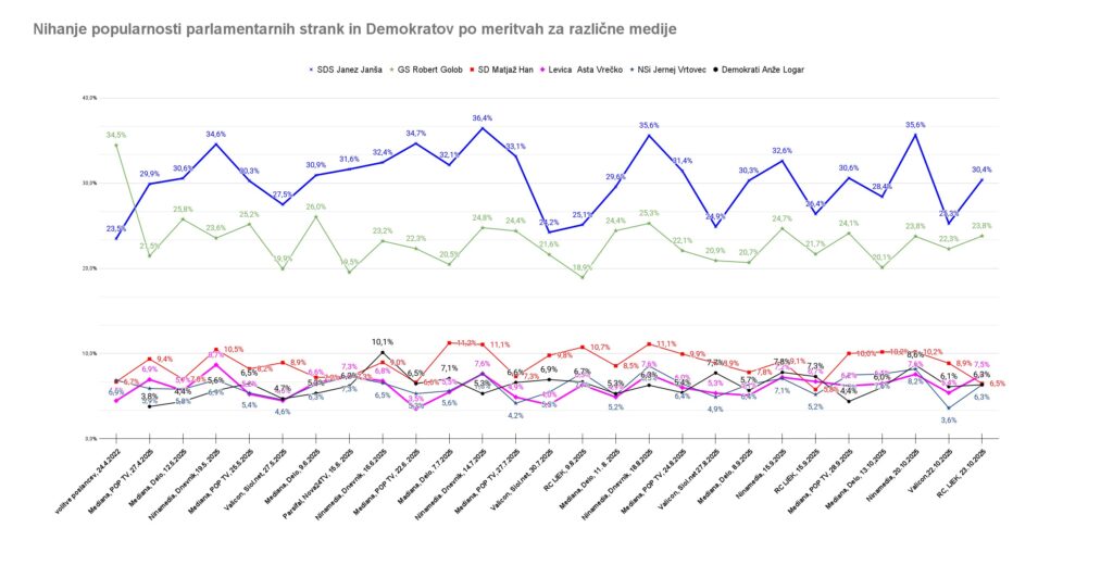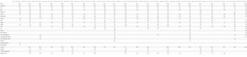 V grafikah in članku v Spletnem časopisu so deleži podpore strankam preračunani tako, da so upoštevani le za stranke opredeljeni volivci. To omogoča primerjavo z volitvami in med raziskavami. Med opredeljene za stranke štejem tudi izbiro “druge” stranke. To so praviloma tiste, ki anketiranim niso ponujene, se jih pa sami spomnijo. Izvirni deleži podpore strankam različnih raziskav, kot so jih objavili mediji, ki so temelj za preračune, so objavljeni v preglednici (s klikom lahko vse preglednice povečate):