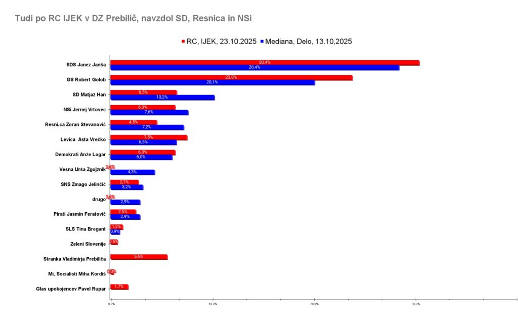 RC IJEK je izmeril tudi popularnost strank in za agencijo Valicon dan prej so tudi oni zaznali, da bi se v državni zbor uvrstila nova stranka Preboj Vladimirja Prebiliča. A bolj pri dnu strank. V primerjavi z Mediano za Delo, ki ni merila Preroda in kjer Levice niso ponujali skupaj z Vesno, je RC IJEK nameril boljši rezultat obema največjima strankama, SDS in Svobodi.