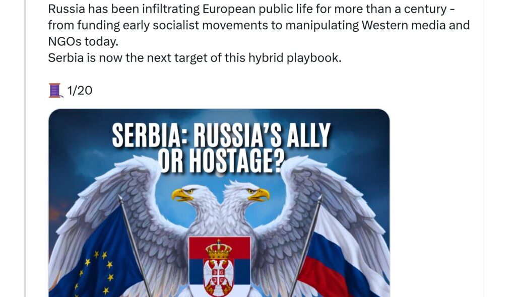 Za Srbijo je EU največjih trgovinski partner, investitor in donator, za članstvo v EU Srbija kandidira že od leta 2012. Portal opozarja, da je vtis, kako je predsednik Srbije Aleksander Vučič le ruska marioneta na Balkanu, napačen in razkriva povezave opozicijskih medijev, denimo N1, ki deluje tudi pri nas, s podjetji povezanimi z Rusijo. Opozarjajo na pomembno vlogo nekdanjega podpredsednika Gazpromove banke v Švici Wolframa Kuonija, ki bi naj bil znan tudi kot Kremeljski bančnik, ki sedi v upravnem odboru največje srbske zasebne televizije, z njegovo pomočjo bi naj denar iz ruskih podjetij potoval v srbske medije. Dragan Šolak bi naj uporabljal enake kanale za nakup največjega srbskega oglaševalskega in televizijskega omrežja, ki ga je potem prodal nazaj svojemu lastnemu holdingu. N1, ki posluje tudi v Sloveniji, se hvali, da je ekskluziven po povezavi z ameriško CNN, a bi naj dejansko bil bolj odmev stališč Kremlja. Ko Zahod obtožuje Vučića, da je preveč blizu Moskvi, z Moskvo povezani opozicijski poslovneži “svoboden tisk” spreminjajo še v eno orožje pritiska Moskve na Srbijo, ocenjujejo v analizi na Visegrad 24 in nadaljujejo, da se Moskva tu ne bori s tanki, vojna poteka s transakcijami, spopad ni z vojaki, je z nakupi deležev. Srbija pa je na prvi frontni črti.