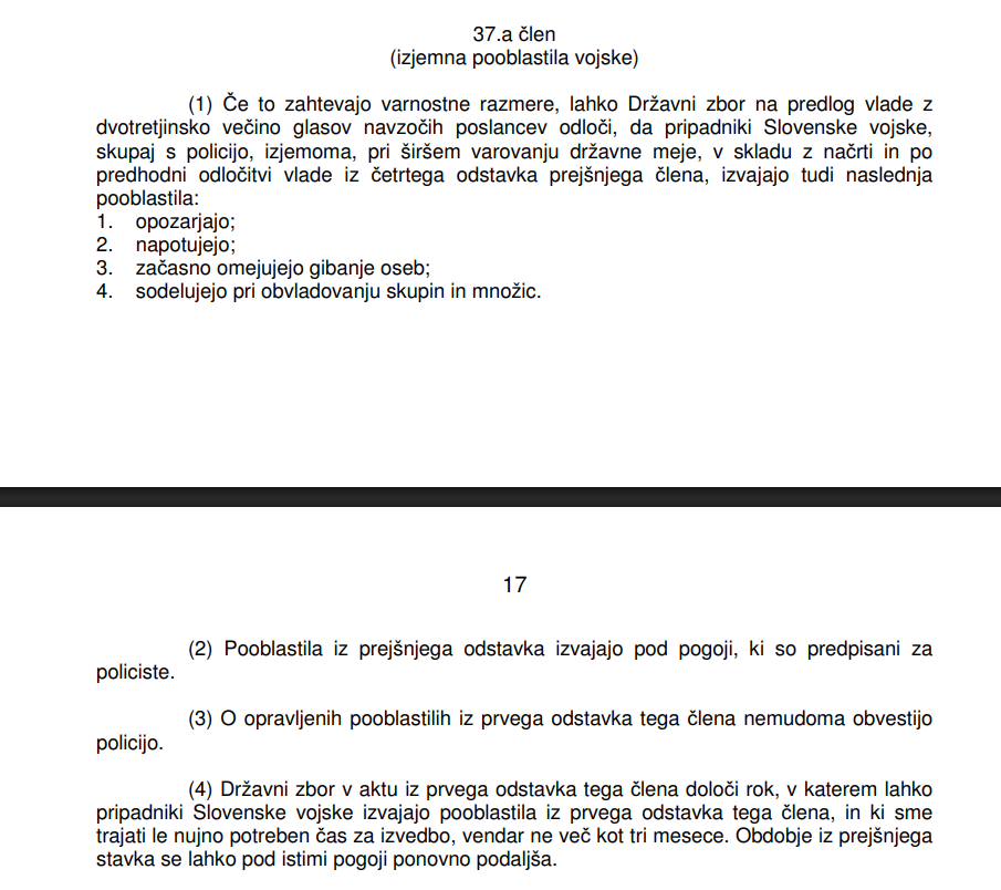 “Po tragičnem dogodku v Novem mestu je za zagotavljanje varnosti na območju Dolenjske prisotno večje število policistov, zato so se člani SSNAV strinjali o aktivaciji mešanih patrulj slovenske policije in vojske, pri čemer bo vojska zagotovila podporo s kadri in tehniko. Prisotnost mešanih patrulj na terenu bo skladna z veljavnim načrtom o sodelovanju med slovensko vojsko in policijo. Enak ukrep je bil sprejet leta 2015 ob migrantskem valu in se je izkazal za učinkovito podporo policiji pri izvajanju njenih nalog za zagotavljanje varnosti. Člani SSNAV predlagajo, da se za dodatne posebne obremenitve policistov zagotovijo finančna sredstva. Člani SSNAV vladi predlagajo, da se 37. člen aktivira do enega leta, pri čemer se bodo redno mesečno preverjale varnostne razmere. Vlada bo o sklepu SSNAV odločala v najkrajšem možnem času. ”
