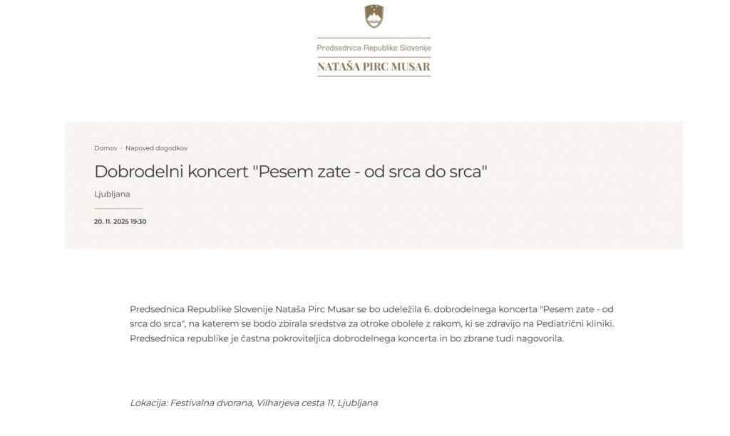 Tako so mi iz urada predsednice republike Nataše Pirc Musar odgovorili, koliko bo predsednica, ki bo danes častna pokroviteljica dobrodelnega koncerta “Pesem zate – od srca do srca”, na katerem se bodo zbirala sredstva za otroke obolele z rakom, ki se zdravijo na Pediatrični kliniki, prispevala za otroke obolele z rakom. Dodatno sem vprašal tudi, ali bo med donatorji tudi njen soprog Aleš Musar, ki je znan kot premožen podjetnik. Prosil sem tudi, če sta med donatorji, za vsote obeh.