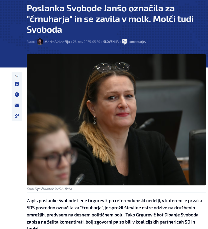 Zdi se, da poslanka ne razume kritik, da rasistične zmerljivke s črnuharji, s katerimi je treba obračunati, niso najboljša izbira za predsednico odbora za pravosodje, ki je del oblastne nomenklature. Tudi če na ta način zmerja opozicijskega voditelja. Ali pa še prav v tem primeru ne.