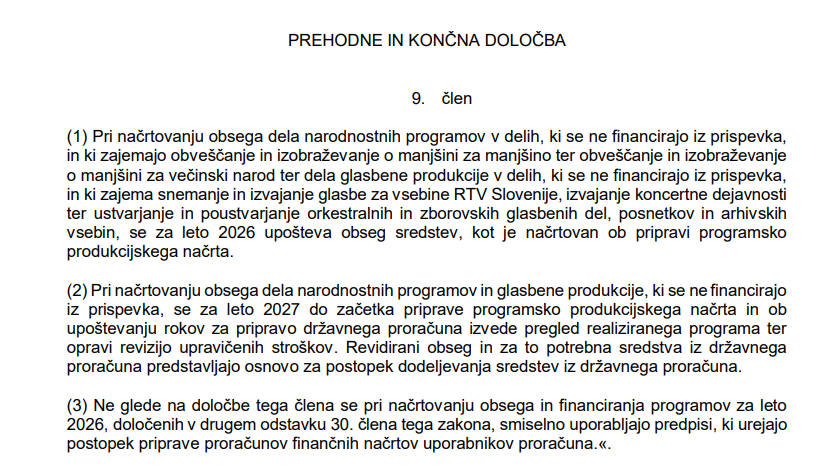 A prehodna določba v zakonu pravi, da bodo denar za leto 2026 za manjšine in glasbene vsebine dali po programsko produkcijskih načrtih RTV SLO same, ki pa dodaten denar za prihodnje leto, ki še ni uzakonjen, že načrtuje. Vlada je to skrila v opisu finančnih posledic, ko pravi, da bodo novosti obveljale šele leta 2027. Tako pravi prehodna določba: