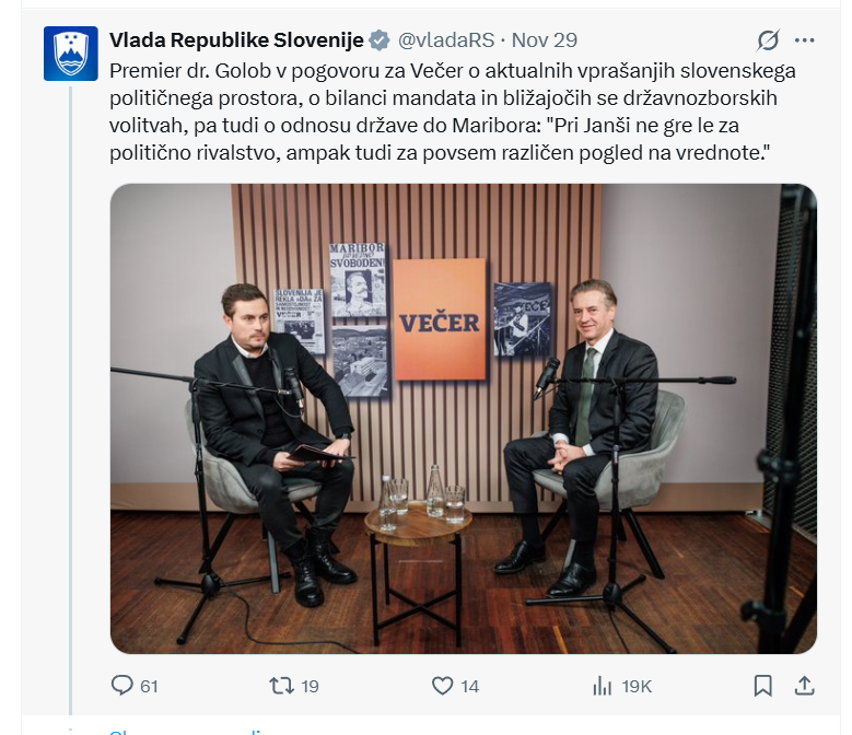 Intervju odgovornega urednika Večera z Golobom je z glavnim propagandnim sporočilom, ki je Janša, vlada propagirala tako: