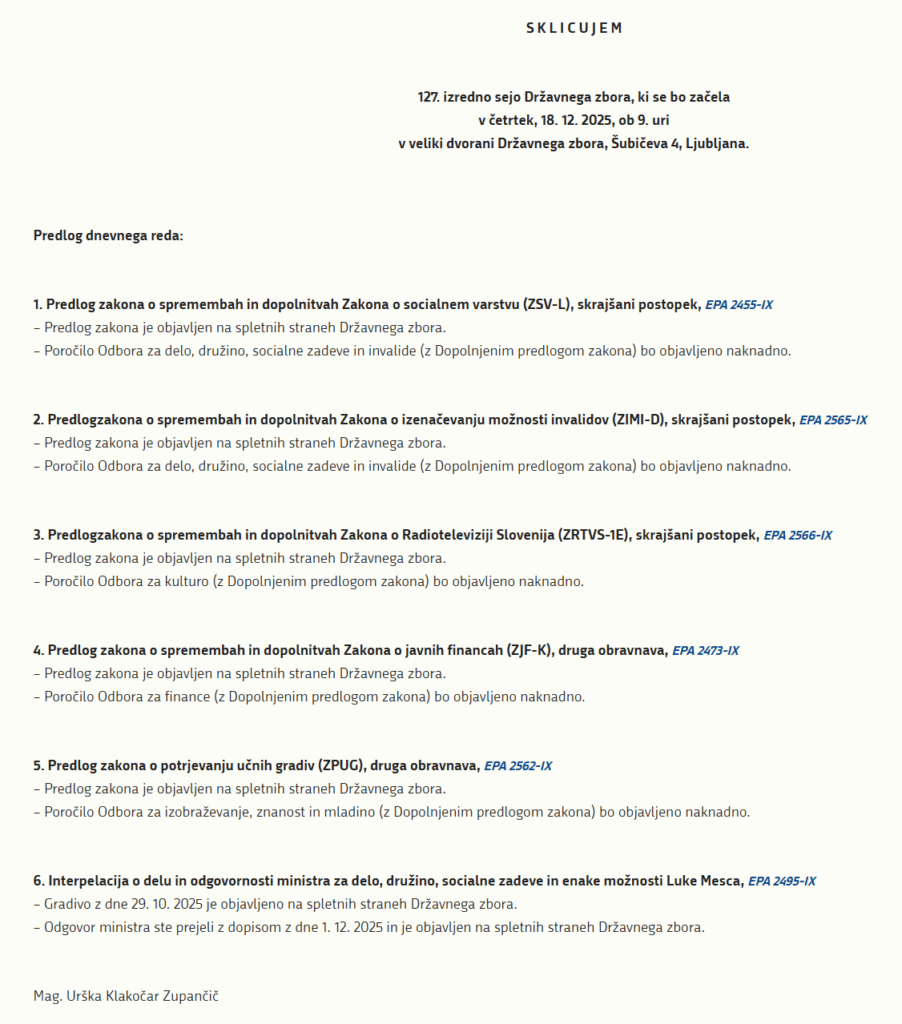Na tej izredni seji sredi decembra in ne na redni seji parlamenta pred tem, bo tudi razprava o interpelaciji proti ministru za delo Luki Mescu.