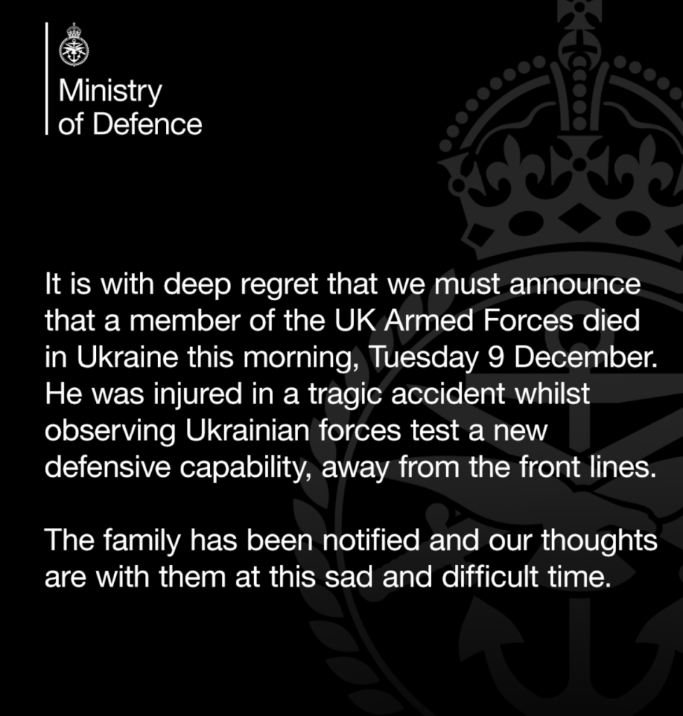 “Z globokim obžalovanjem moramo sporočiti, da je danes zjutraj, v torek, 9. decembra, v Ukrajini umrl pripadnik Oboroženih sil Združenega kraljestva. Poškodovan je bil v tragični nesreči med opazovanjem ukrajinskih sil pri testiranju nove obrambne zmogljivosti, daleč od frontne črte.”