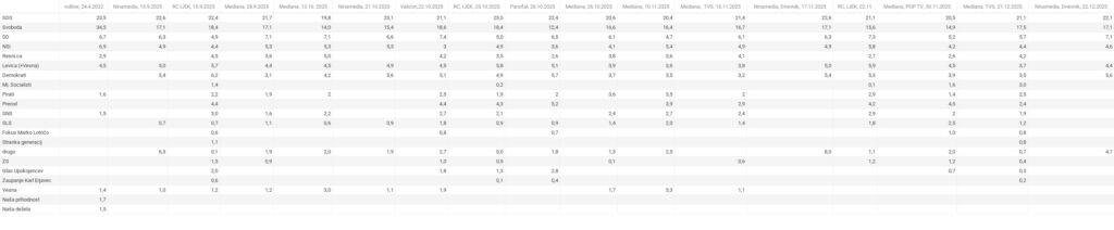 Svoboda Roberta Goloba je s 26,1 odstotka daleč za SDS Janeza Janše s 33,7 odstotka tudi po meritvi Ninamedie za Dnevnik, objavljeni na dan, ko je predsednica republike Nataša Pirc Musar napovedala, da bo volitve poslancev razpisala za 22. marec. Ninamedia v svoji v anketi ob petih parlamentarnih strankah ponuja le še Demokrate Anžeta Logarja. V vprašalniku pa ni množice drugih novih in manjših stranka. Na volitvah pred skoraj štirimi leti je Svobodo, če upoštevamo tudi deleže SAB in LMŠ, volilo 40,8 odstotka volivcev, zdaj bi jo po Ninamedii 26,1. SDS je pred štirimi leti voli 23,5 odstotka volivcev, zdaj bi jo 33,7 odstotka, je izmerila Ninamedia. Visoka deleža obeh strank, če ju primerjamo z meritvami Mediane, sta posledice vprašalnika, ker Ninamedia meri le pet parlamentarnih strank, ki jim je dodala Demokrate. Demokrati Anžeta Logarja znižujejo delež predvsem SDS, katere člana sta bila nekoč Logar in Eva Irgl. V deleže Svoboda pa bi lahko posegli Resni.ca, Prerod in podobni, če bi jih ponudili. A jih ne. Kot še vrste drugih strank ne.