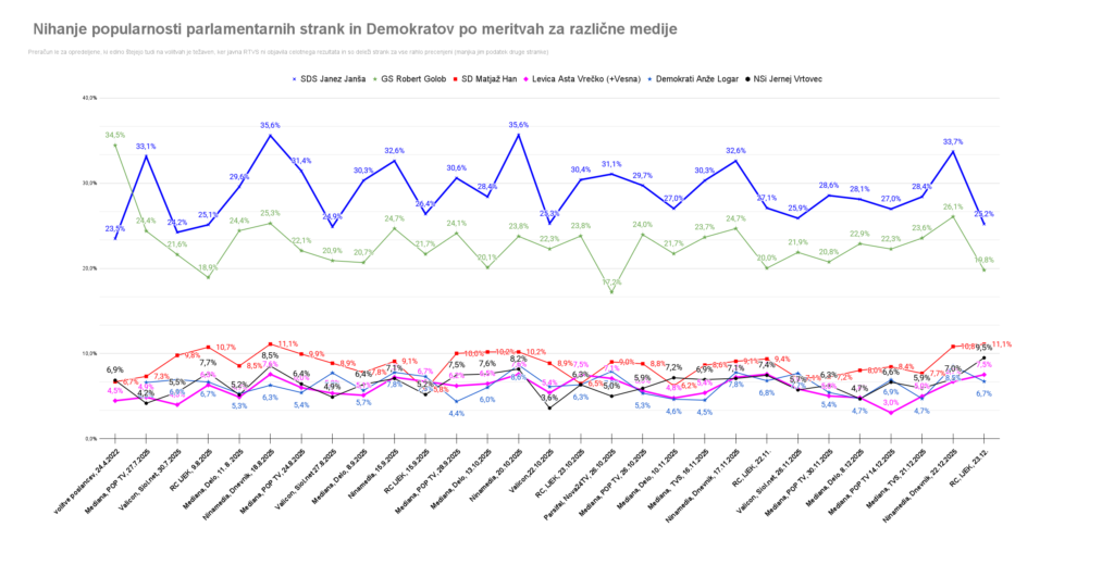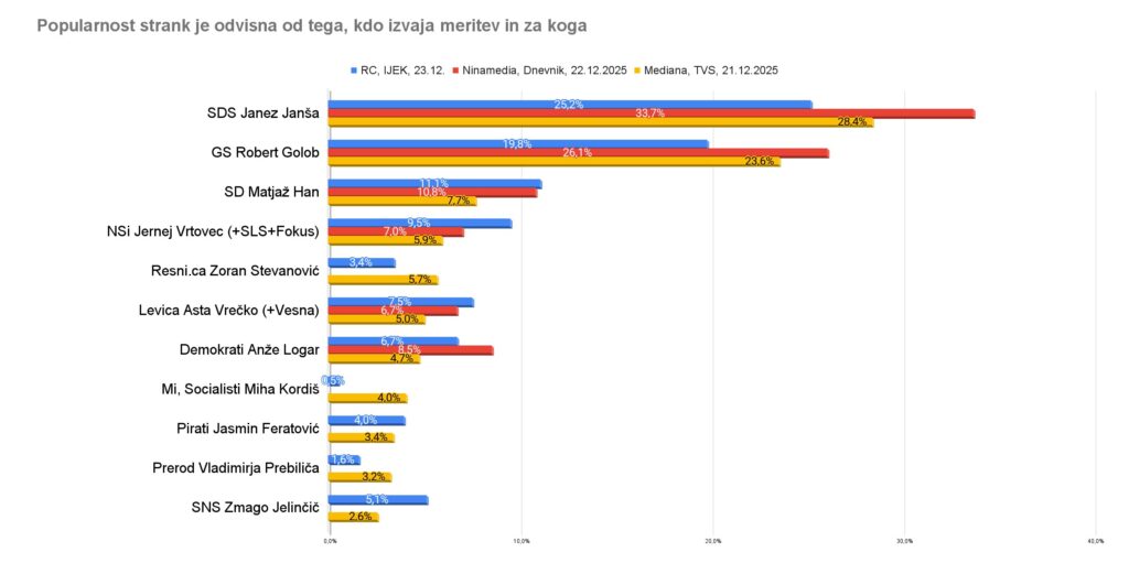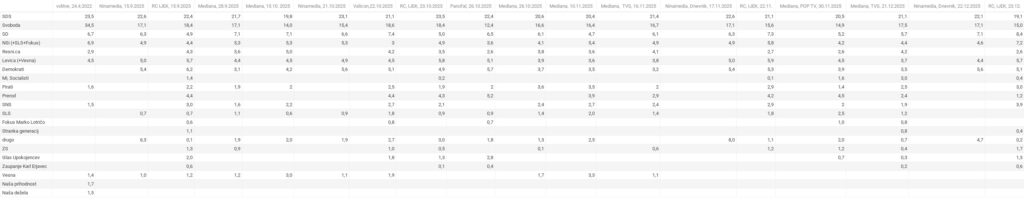V tem tednu, ko je predsednica republike Nataša Pirc Musar razkrila, da bodo volitve 22. marca, je bila objavljena cela množica raziskav javnega mnenja. Kar tri: Mediane, ki velja za agencijo blizu največjim liberalnim strankam (Svobodi, prej LMŠ…) na TVS, Ninamedie Nikole Damjanića v Dnevniku, ki sodi k Zoranu Jankoviću in nazadnje še Inštituta Janeza Evangelista Kreka, ki so ga ustanovili politiki NSi.