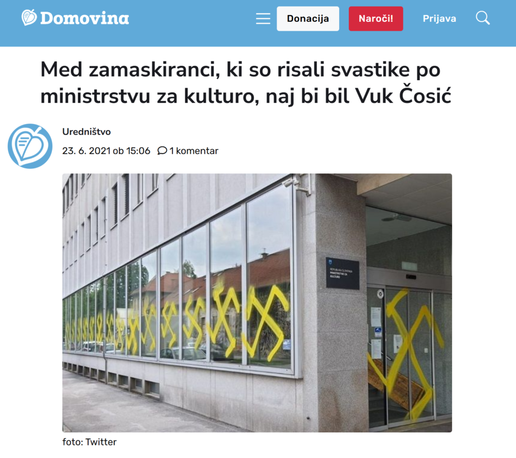 Kot medij, ki širi lažne novice, se je ta teden odzvala ministrica za kulturo Asta Vrečka, ko ji je Nikola Jokanović s kljukastimi križi porisal stekla na ministrstvu. To je storil na enak način kot Vuk Čosić v času prejšnje vlade. Plagiral ga je. Čosić je eden od avtorjev spominka mehkemu ć v Ljubljani, ki ga je pomagal narediti po tem, ko je v času prejšnje vlade po stavbi ministrstva za kulturo risal kljukaste križe. Da spomnimo: