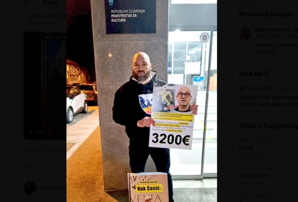 Kot medij, ki širi lažne novice, se je ta teden odzvala ministrica za kulturo Asta Vrečka, ko ji je Nikola Jokanović s kljukastimi križi porisal stekla na ministrstvu. To je storil na enak način kot Vuk Čosić v času prejšnje vlade. Plagiral ga je. Čosić je eden od avtorjev spominka mehkemu ć v Ljubljani, ki ga je pomagal narediti po tem, ko je v času prejšnje vlade po stavbi ministrstva za kulturo risal kljukaste križe. Da spomnimo: