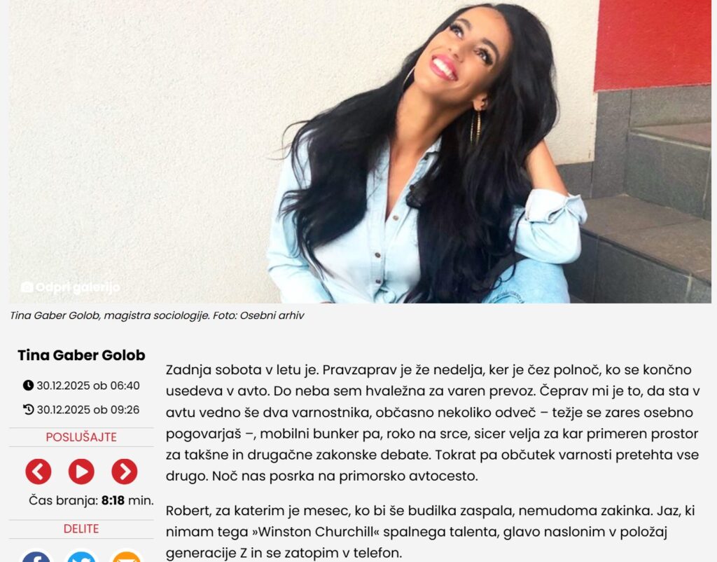 O dosežkih vladanja v letu, ki mineva, smo tik pred koncem tega leta še zadnjič govorili v Uri Resnice, ki jo je tokrat vodil Aljuš Pertinač. Boštjan M. Turk je opozoril, da je leto zaznamovala poroka Roberta Goloba s Tino Gaber, ki je tik pred volitvami postala celo kolumnistka revije Ona Plus, ki jo izdaja vladno financirano Delo Stojana Petriča. Kot že prej Nika Kovač kolumnistka Siol.net, ko je Golob tja nastavil svoj vrh. Gabrova kolumno, ki je bila objavljena ta teden, reklamira tako: