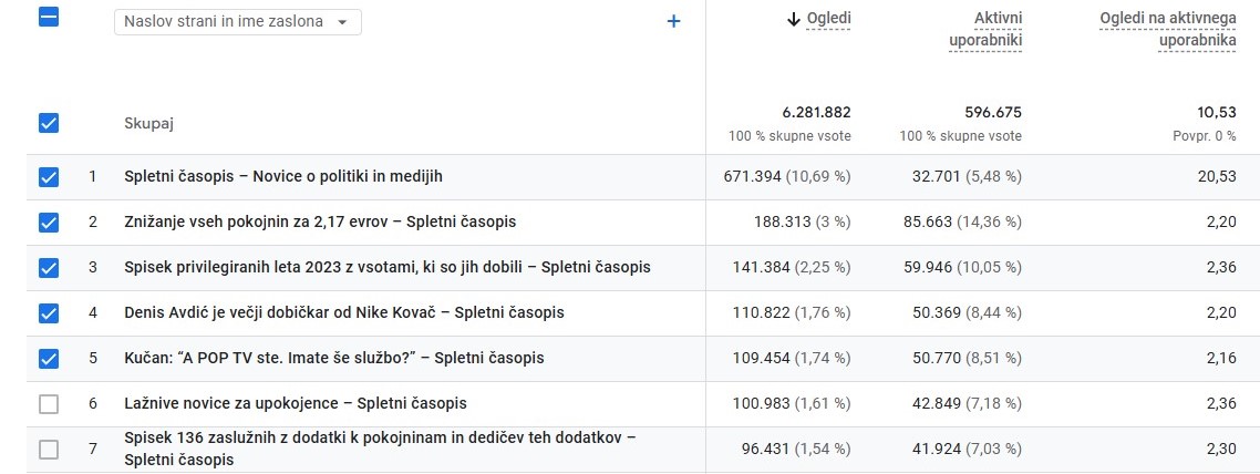 Vseh pet najbolj branih člankov je iz prve polovice leta, pozneje je Google Spletni časopis postavil v nižjo ligo pri ponudbi novic na androidnih telefonih, kar je znižalo število bralcev. Daleč najbolj brano v lanskem letu je bilo poročilo iz februarja, kako se bodo vsem upokojencem znižalepokojnine za 2,17 evrov. Znižanje se je zgodilo, ker so poslanci Svobode, SD in Levice ukinili prostovoljno dodatno zdravstveno zavarovanje, a tako, da so uvedli obvezen prispevek, ki je poskočil iz 35 evrov na 37,17 evra. V preteklosti davkov in prispevkov upokojencem iz pokojnin niso trgali. Po novem jih.