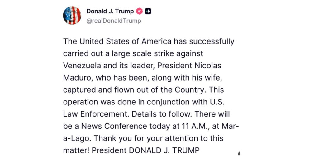 Ameriški zračne sile in mornarica so bombardirali cilje v Venezueli. Posnetki iz Venezuele kažejo, da so helikopterji obstreljevali vojaška oporišča v glavnem mestu Venezuele Caracas, letališča in komunikacijske centre po državi. Po prvih informacijah se zdi, da ni šlo za veliko vojaško invazijo, kaže na omejeno operacijo, katere cilj bi lahko bila dodatna slabitev ali celo napad neposredno na diktatorja Nicolása Maduro, ki je na oblasti ostal po nepošteno izvedenih volitvah. Ameriški predsednik Donald Trump je na svojem družabnem omrežju objavil sporočilo, “da so ZDA uspešno izvedle obsežen napad na Venezuelo in njenega voditelja, predsednika Nicolasa Madura, ki je bil skupaj z ženo ujet in odpeljan iz države, operacija je bila izvedena v sodelovanju z ameriškimi organi pregona.” Več bo Trump, je še zapisal, pojasnil na tiskovni konferenci.