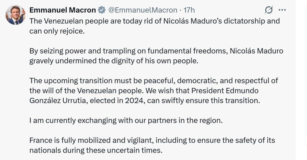 Povsem drugače se je odzval francoski predsednik Emmanuel Macron, s katerim se Golob sicer pogosto prijateljsko druži: Venezuelsko ljudstvo se je danes znebilo diktature Nicolása Madura in se lahko le veseli. S prevzemom oblasti in teptanjem temeljnih svoboščin je Nicolás Maduro hudo spodkopal dostojanstvo lastnega ljudstva. Prihajajoči prehod mora biti miren, demokratičen in spoštovati voljo venezuelskega ljudstva. Želimo si, da bi predsednik Edmundo González Urrutia, izvoljen leta 2024, hitro zagotovil ta prehod. Trenutno se pogovarjam z našimi partnerji v regiji. Francija je popolnoma mobilizirana in budna, tudi zato, da bi zagotovila varnost svojih državljanov v teh negotovih časih.”