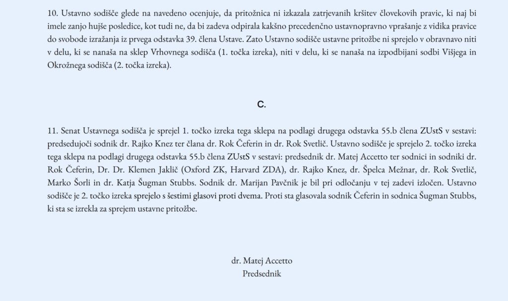 Ustavno sodišče je leta 2022 pojasnilo, da primera ne bo presojalo, ker pritožnica (Mladina) ni podala zadostnih trditev in dokazov, zakaj naj bi imela naložena ji odškodninska sankcija zanjo zastraševalni učinek. Kajti zastraševalni učinek kršitelju naložene sankcije se preizkuša predvsem z vidika, ali je časopisni hiši naložena odškodninska sankcija tako visoka, da lahko ogrozi njene ekonomske temelje; v tej zadevi pa je očitno, da ni tako. Ocenila pa so tudi, da zadeva ni odpirala kakšno precedenčno ustavnopravno vprašanje z vidika pravice do svobode izražanja iz prvega odstavka 39. člena Ustave. Zato Ustavno sodišče ustavne pritožbe ni sprejelo v obravnavo.