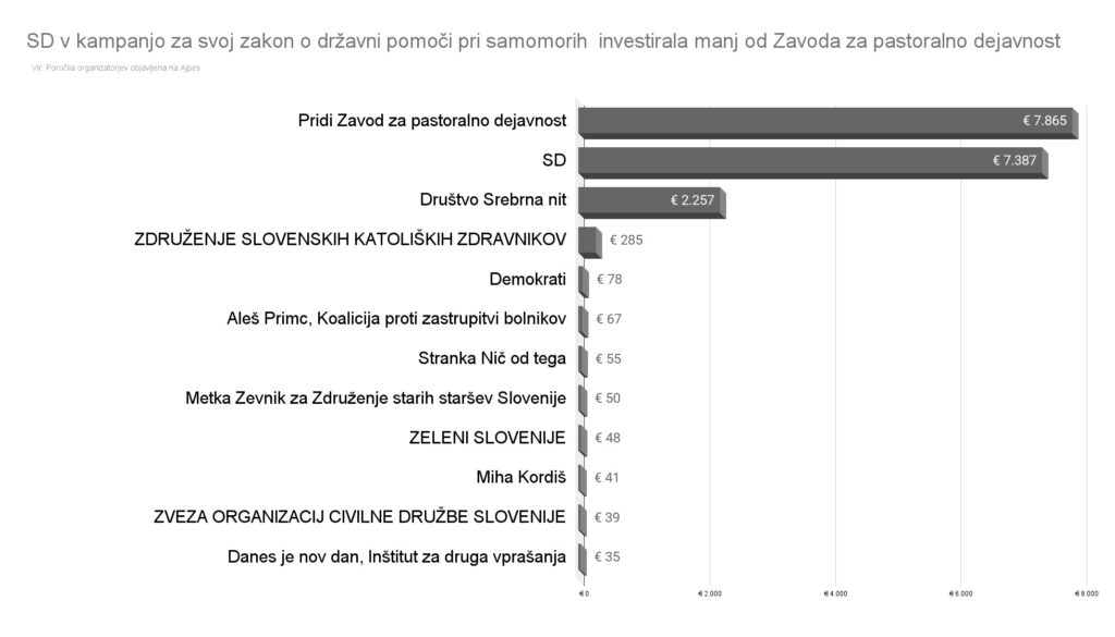 SD ni skoraj nič investirala v kampanjo za zakonu o pomoči pri prostovoljnem končanju življenja, ki so ga parlamentu predlagali in ga tam tudi izglasovali poslanci Svobode, SD in Levice. V kampanjo pred referendumom, na katerem so volivci poslanski zakon odločno zavrnili, so za prepričevanje volivcev vložili le 7.387 evrov, je portalu Ajpes iz SD poročala Živa Živković. Na posebni račun za kampanjo jim nihče ni prispeval niti centa. Ves denar so pridobili tako, da so si ga nakazali iz rednega računa stranke. To kaže, da stranka s svojim zakonom ni uživala podpore ljudi. Nič niso prispevali za kampanjo. Več od njih, 7.865 evrov, je prepričevanje ljudi, naj glasujejo proti, investiral Zavod za pastoralno dejavnost. A enako le iz rednega računa. Največji stranki, SDS in Svoboda, o vložkih v kampanje še nista poročali. V SD so bili podobno varčni že na referendumih v preteklosti. V kampanjo za čistko na RTVSLO so vložili 10.574 evrov. 8. marec Nike Kovač je v podporo temu zakonu vladnih strank takrat investiral 42.065 evrov. Gibanje Svoboda pa 68.170 evrov. V prepričevanje ljudi pred referendumom o dosmrtnih dodatkih k pokojninam zaslužnih kulturnikov pa so v SD investirali še manj. Vsega 63 evrov za odprtje in zaprtje posebnega računa. Tisti referendum je bil po rezultatu največji polom vladnega zakona v zadnjih desetletjih sploh.