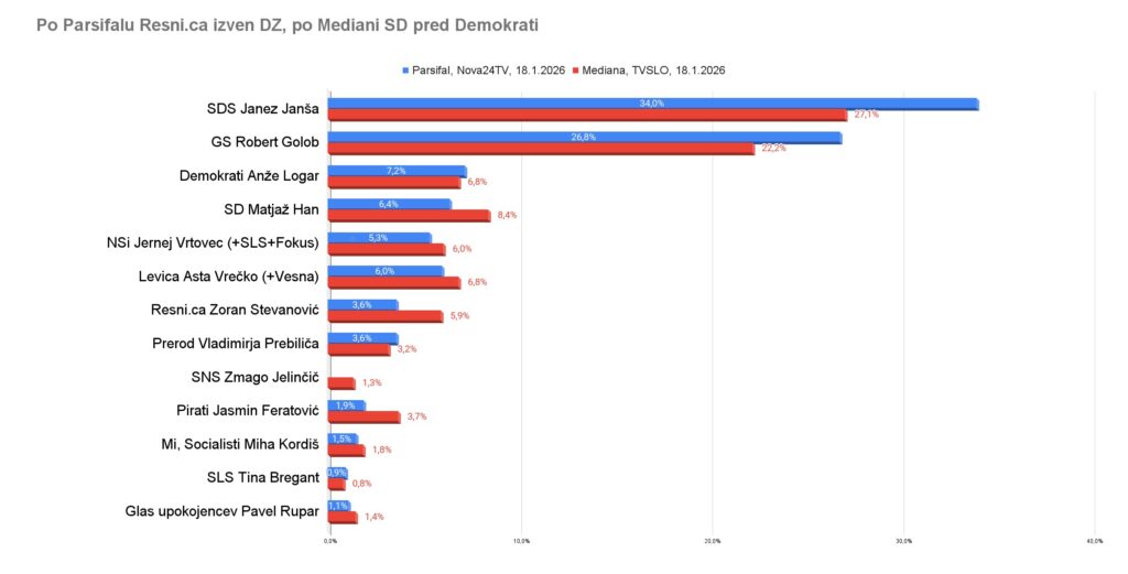 Janez Janša bi sestavil desno koalicijo s pomočjo SDS, Demokratov in NSi sta čez vikend pokazali dve raziskavi: po Ninamedii za Dnevnik bi te tri stranke zbrale 44,2 odstotka vseh glasov, po Parsifalu za Novo24TV pa 46,4 odstotka. V obeh primerih bi to zagotovilo odločno večino sedežev v državnem zboru in s tem preprost prevzem oblasti. Po Mediani za TVSLO pa bi oblast obdržal Robert Golob. Večino v DZ bi vladne stranke sicer izgubila, a bi ohranile oblast. Za SDS, Demokrate in NSI bi bilo 39,9 odstotka glasov, za Svobodo, SD in Levico 37,5. O večini pa bi odločila Resni.ca Zorana Stevanovića s 5,9 odstotka, ki možnost sodelovanje s SDS in Janšo zavrača. Po meritvi Mediane za TVS je Resni.ca zbrala bistveno višji delež kot v drugih dveh raziskavah. Vse tri so bile objavljene v soboto in nedeljo. Po Ninamedii bi Resni.ca komaj prišla v DZ s 4.1 odstotka, po Parsifalu bi izpadla s 3,6 odstotki. Po Mediani pa bi Golobu zagotovila nadaljevanje vladanja s 5,9 odstotki. Vse tri meritve vsebujejo enako napako. Skupaj merijo Levico in Vesno, ločeno pa NSi, SLS in Fokus, čeprav so slednji enako napovedali skupen nastop. To znižuje delež NSi Jerneja Vrtovca v vseh treh raziskavah in ga nekoliko viša Levici. Pri Parsifalu med strankami niso merili SNS Zmaga Jelinčiča.