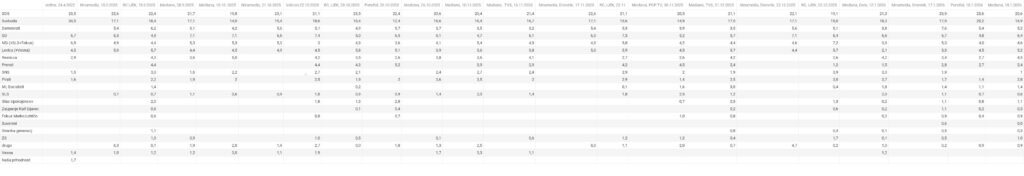 V grafikah in članku v Spletnem časopisu so deleži podpore strankam preračunani tako, da so upoštevani le za stranke opredeljeni volivci. To omogoča primerjavo z volitvami in med raziskavami. Med opredeljene za stranke štejem tudi izbiro “druge” stranke. To so praviloma tiste, ki anketiranim niso ponujene, se jih pa sami spomnijo. Izvirni deleži podpore strankam različnih raziskav, kot so jih objavili mediji, ki so temelj za preračune, so objavljeni v preglednici (s klikom lahko vse preglednice povečate):