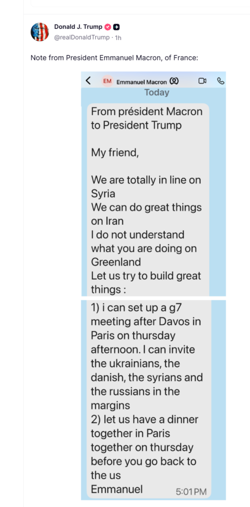 Objavil pa je tudi telefonsko sporočilo od predsednika Francije Emmanuela Macrona, v katerem mu ta sporoča, da podpira njegovo politiko v Iranu, da je v Siriji mogoče doseči velike stvari, da pa ne razume, kaj počne v Grenlandiji. Macron ga vabi na kosilo.