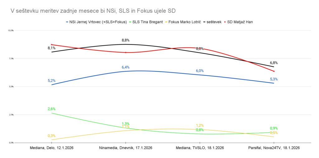 Sporazum o skupnem nastopu na volitvah bodo danes podpisali predsednik NSi Jernej Vrtovec, predsednica SLS Tina Bregant in predsednik Fokus Marko Lotrič. Po raziskavah javnega mnenja v tem letu, ki so vse ločene merile te tri stranke, čeprav so že lani napovedale skupen nastop, je NSi daleč najmočnejša med njimi in bi po vseh meritvah prišla v DZ. SLS in Fokus sta se gibala okoli odstotka, po Mediani v začetku leta je SLS poskočila celo do 2,6 odstotka, Fokus pa je bil najvišje po Ninamedii na 1,3 odstotka. Če odstotke strank, ki bodo na volitvah 22. marca nastopile skupaj, seštejemo, bi bila koalicija po moči skoraj izenačena z rezultati SD Matjaža Hana, ki je po meritvah javnega mnenja na tretjem ali četrtem mestu za SDS, Svobodo in občasno Demokrati. Han se je podobno poskušal povezati s Prerodom Vladimirja Prebiliča, a ga je ta zavrnil.